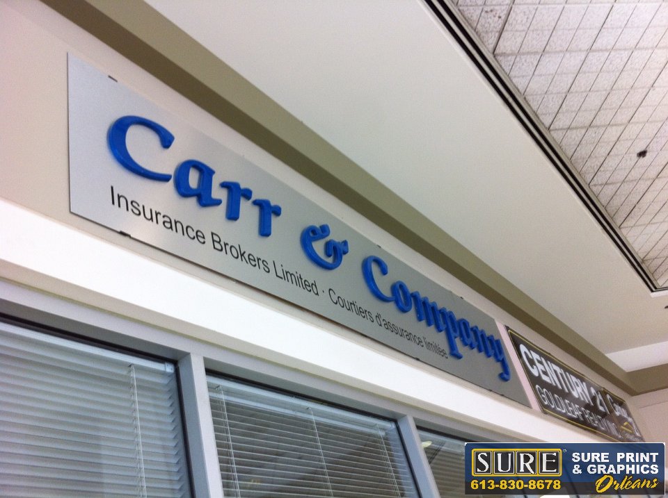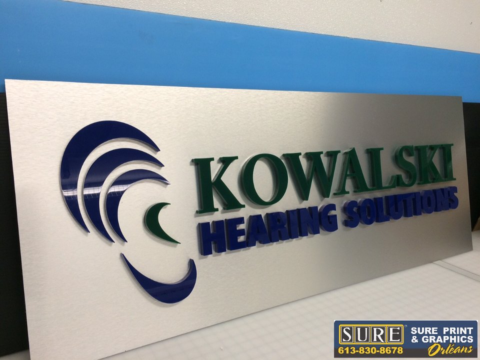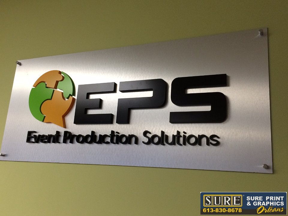 Brushed silver panel with 3D lettering and black vinyl cut lettering