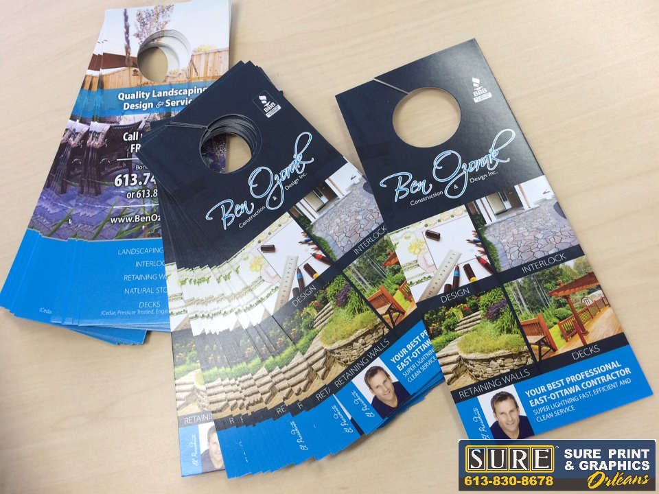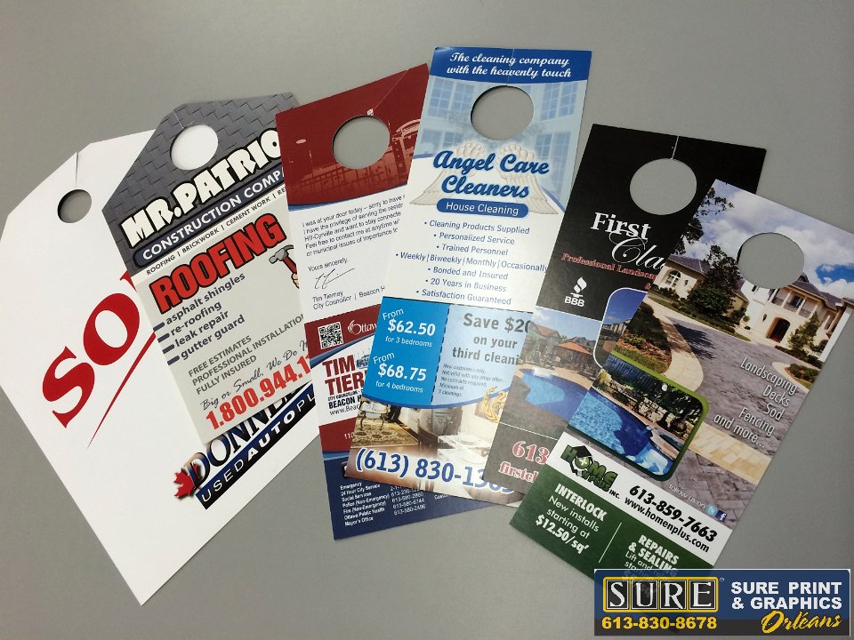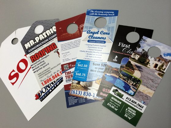 Door hangers  There are many sizes and optional finishes for door hangers.  We can help develop a strategy that works for your business!  Rear view mirror hangers  Great for event parking, dealership advertising etc  Attention grabbing door hanger  This clean, simple design shows the potential client what you do in a quick glance
