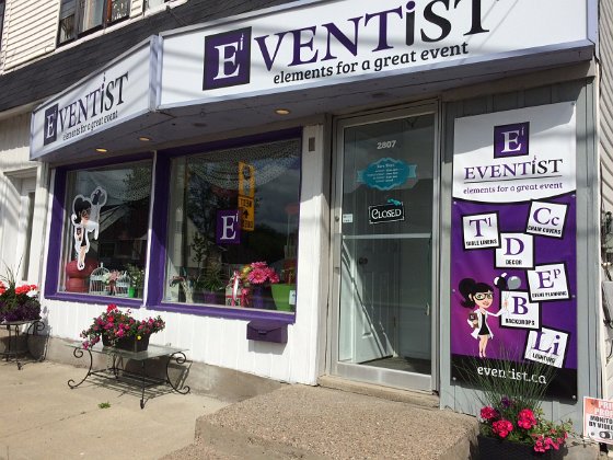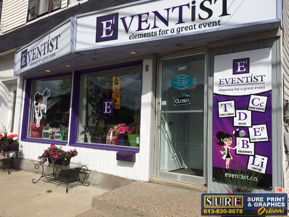 Eventist Storefront  Complete design of storefront image featuring: Building sign boxes, window graphics, door lettering and banner  Brand and Business card  Create new brand, design and print business cards with brand theme  Eventist Cut Vinyl  Wall lettering on bullkhead for showroom  Eventist Labels  Labels designed and printed for multiple applications including packaging